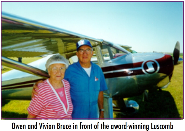 Another key couple in our chapter was Owen and Vivian Bruce. In honor of his 42 years with Chapter 168 and 50 years with EAA, this chapter in 2007 placed Owens name on the EAA Memorial Wall in Oshkosh. He joined EAA in 1953 and was EAA member 629. He joined Chapter 168 in 1964, and was a long time dedicated Technical Counselor. The memorial wall was our way of saying thanks to Owen for sharing his talents and enthusiasm with all of us. Many of us remember his large collection of aircraft magazines and photographs. Many times he was our featured monthly program where he would show his 35mm slides of all kinds of aircraft. There was never an aircraft that he could not identify. He had an incredible memory. He had the stick and rudder skills to fly with Jim Rushing in his Mustang II for a number of years. In 1986 Owen and Jim acquired a Luscombe 8E and proceeded on a total restoration. In November 1988 they finished it and proceeded to Oshkosh and the National Luscombe Convention in Ohio. They won the top award everywhere they went with that Luscombe. A very complete bio for Owen was published in a 2007 Hangar Echoes.