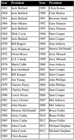 With respect to our chapter’s presidents, take a look at the table which lists each president by year. As you can see a number have served more than one year. Note that Owen Bruce and Mack Cobb were president in 1972 and 1974 respectively. And that Sam Cooper holds the record for being president six times.