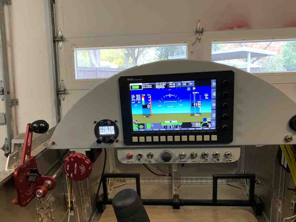 nearly complete. He has all the firewall forward finished. The instrumentation is in and functional. He is using the MGL Avionics instrumentation as is common in many Sonex builds, due to the compactness of the unit and the limit space available in the panel. We did a few functional checks on the control system and everything is looking good.